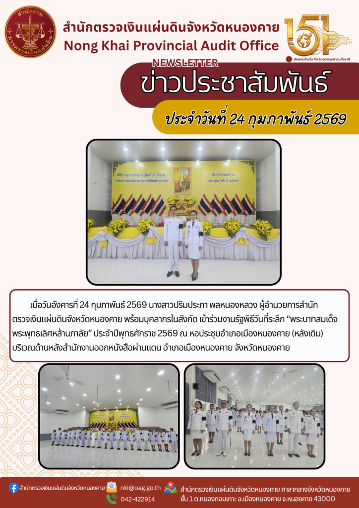 2569-02-24 สตจ.หนองคาย เข้าร่วมงานรัฐพิธีวันที่ระลึก “พระบาทสมเด็จพระพุทธเลิศหล้านภาลัย” ประจำปีพุทธศักราช 2569งานราชพิธี/รัฐพิธี, ภาพกิจกรรมกุมภาพันธ์ 24, 2026กุมภาพันธ์ 24, 2026 Post Views: 45